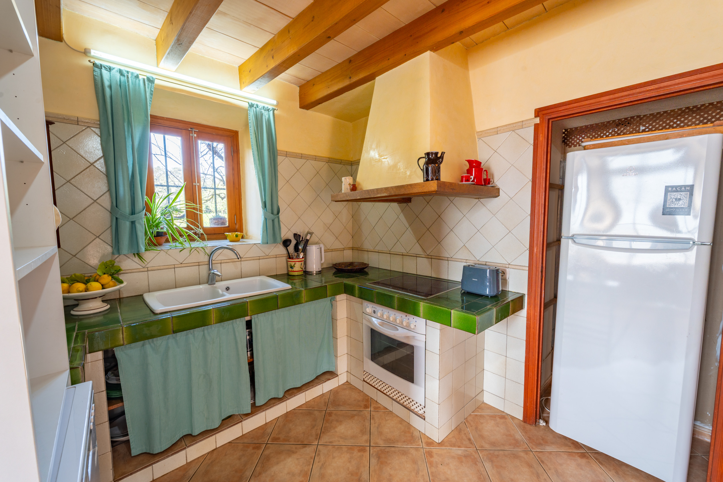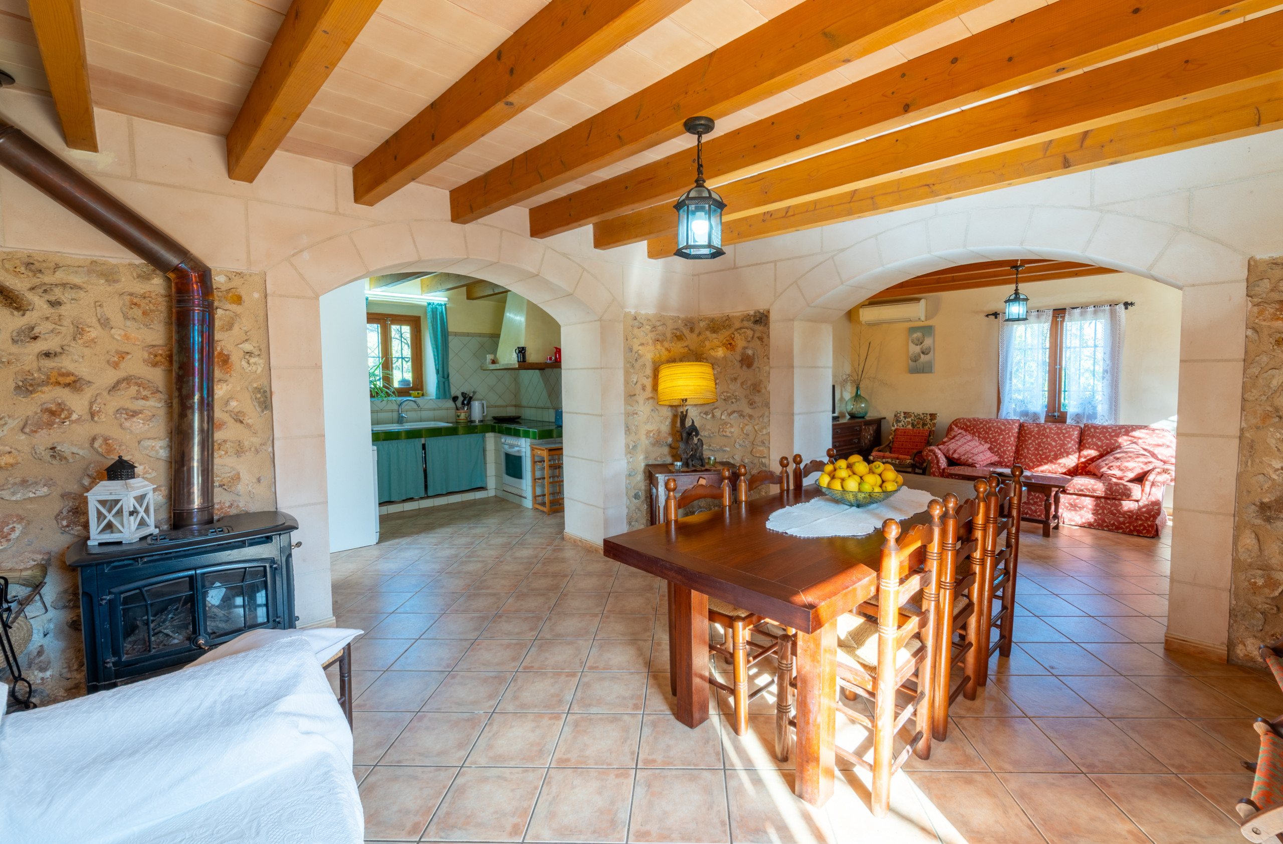 Im Inneren erwartet Sie ein einfaches und gemütliches Haus mit sichtbaren Balkendecken, Lehmböden und viel natürlichem Licht. Im Erdgeschoss befinden sich das Wohn-Esszimmer, die voll ausgestattete Küche, ein praktischer Waschraum und ein Badezimmer. Im Obergeschoss liegen die drei Schlafzimmer (zwei mit Einzelbetten und eines mit Doppelbett) und ein zweites Badezimmer, das Platz für bis zu sechs Personen bietet.